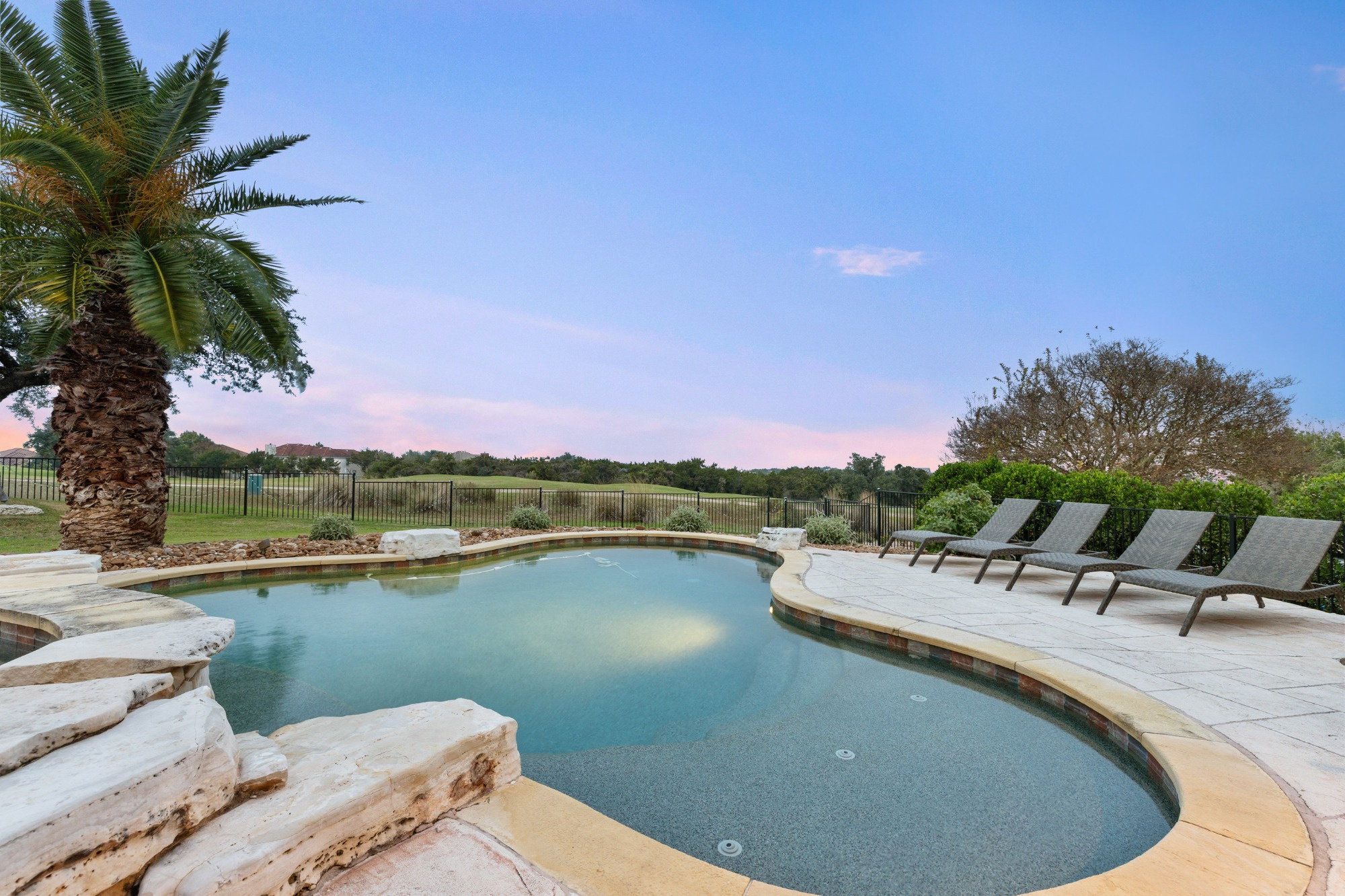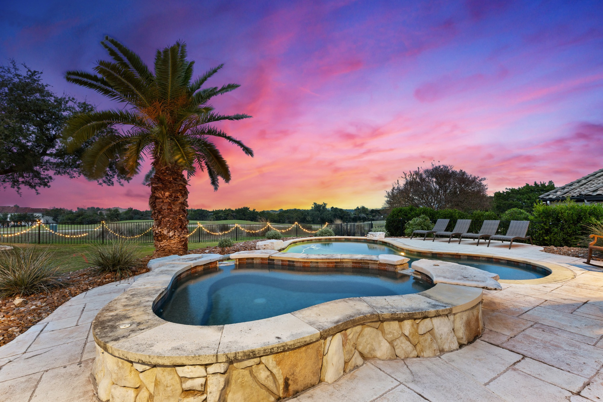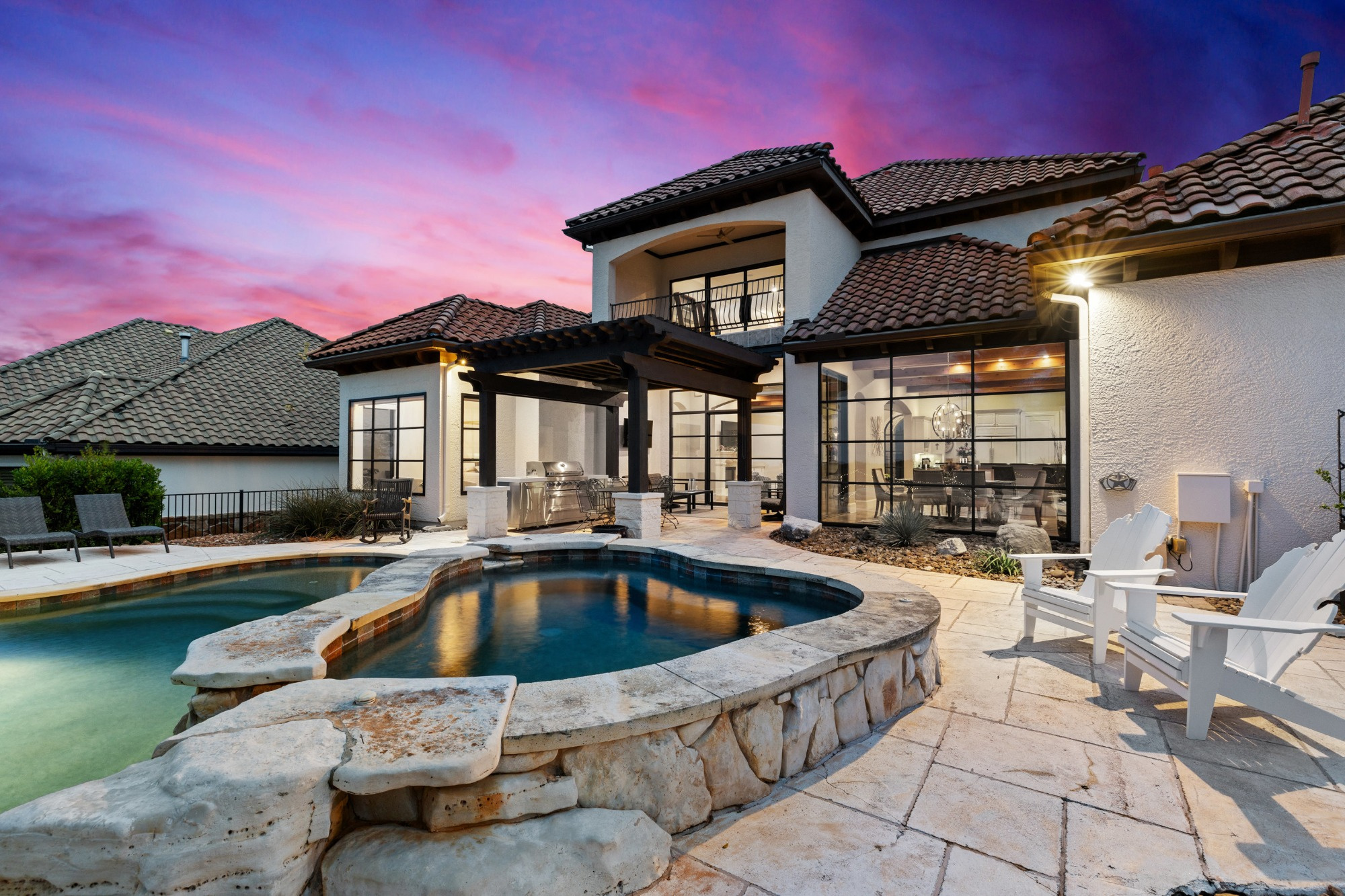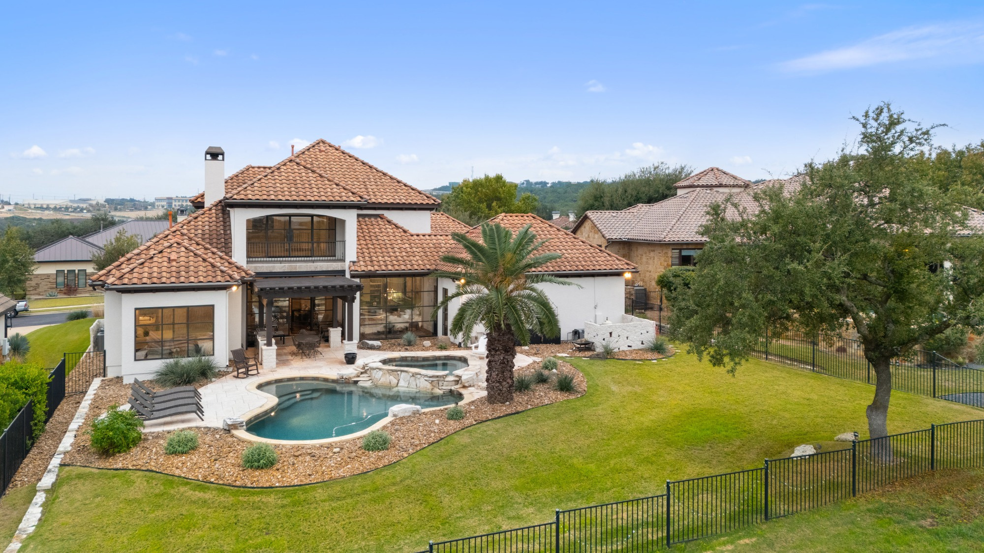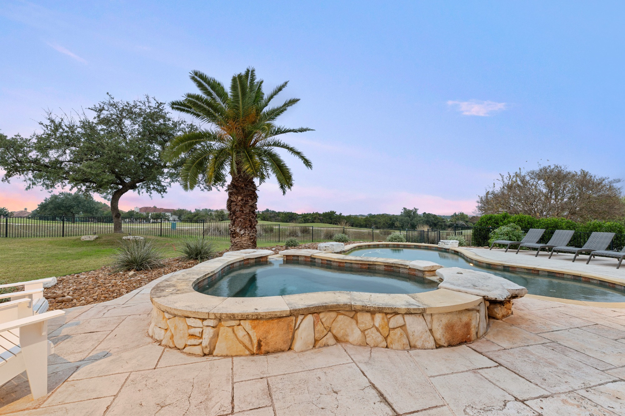 Welcome home to refined gated living in Flintrock Falls. This gorgeous hill country residence was a former Parade of Homes property boasting an exceptional location backing to the 4th green. As you arrive an impressive approach greets you with lush landscaping, circular drive, double front doors, porte cochere and motor court. The interior is just as intriguing with luxe finishes everywhere you look including wood and stone flooring under custom ceilings. Enjoy easy everyday comfort with an open floor plan filled with natural light, private study, a bar at the formal dining plus a stylish fireplace in the living room and floor to ceiling windows. The primary suite offers a luxurious retreat featuring a soaking tub, seamless glass walk in shower with rain showerhead plus a California closet that will make your jaw drop. Upstairs you will find 2 spacious bedrooms both with ensuite baths plus a fantastic game/media room with built in Murphy bed, bar, half bath, and balcony that are perfect for entertaining or an extra guest room. We saved the best for last – the resort style back yard will make you feel like you are on vacation with its pool, spa, patios, and the best panoramic golf views in the area. With over $350k in upgrades, this home is one you don’t want to miss.