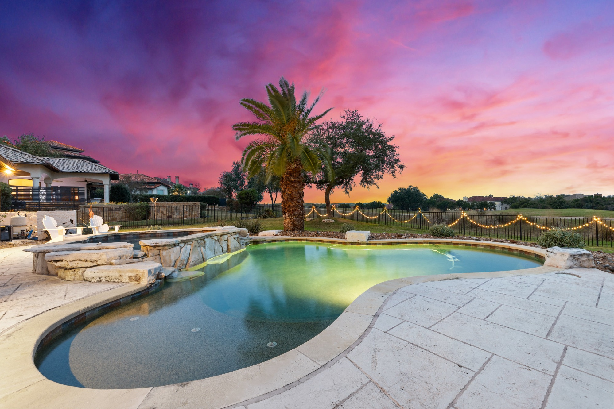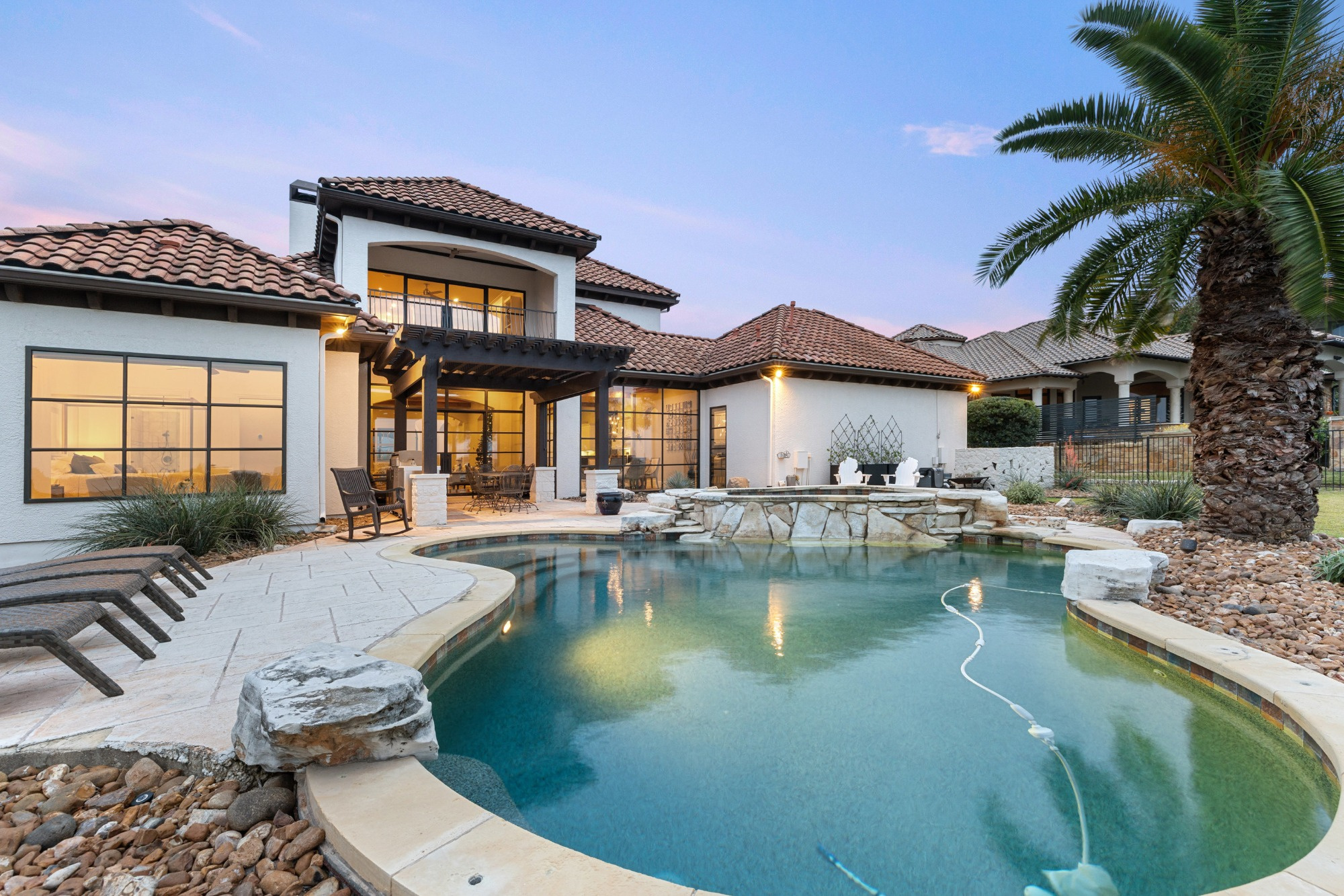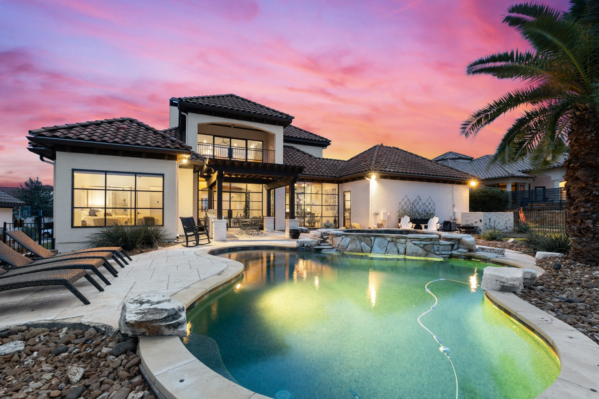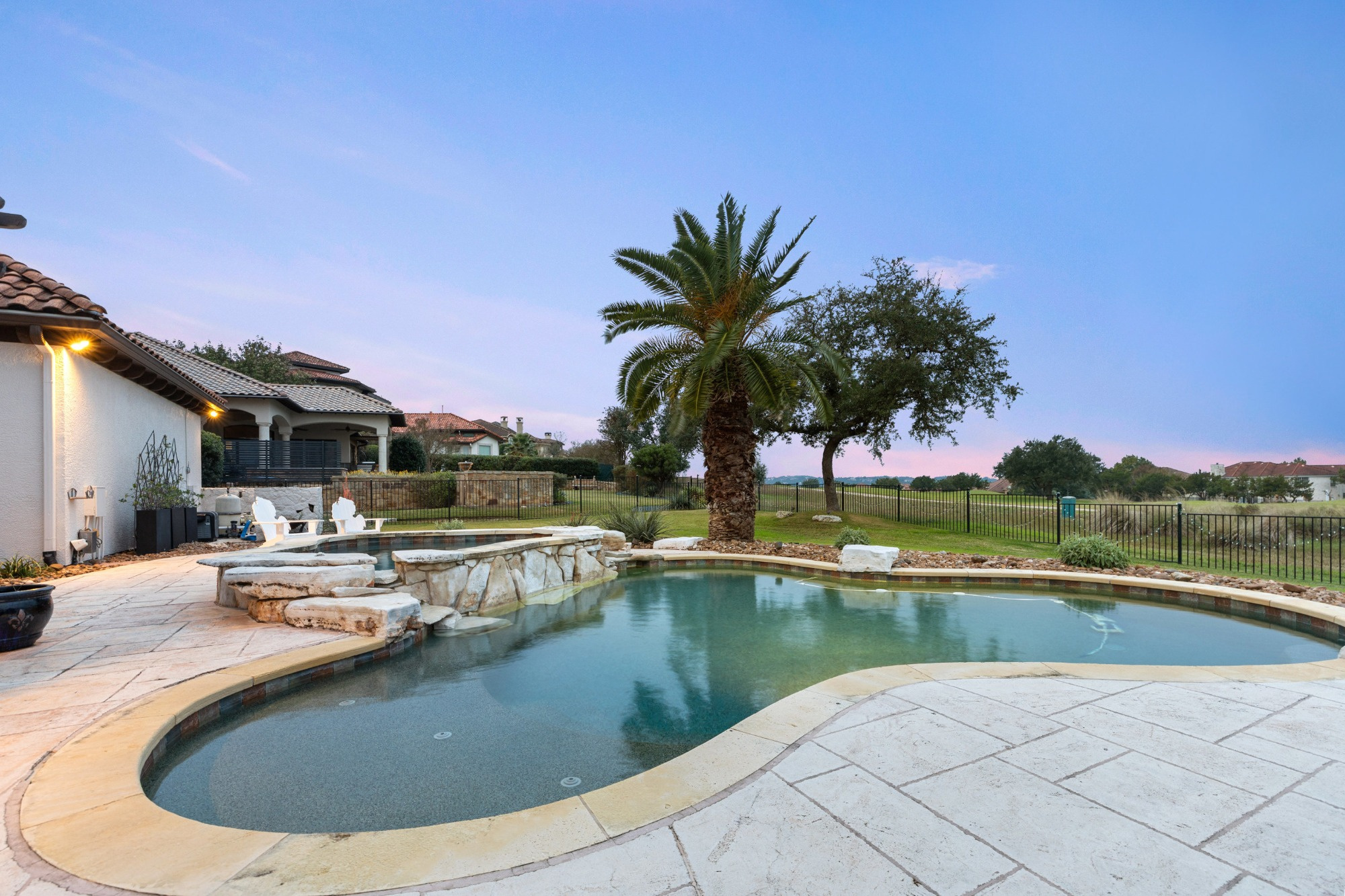 Welcome home to refined gated living in Flintrock Falls. This gorgeous hill country residence was a former Parade of Homes property boasting an exceptional location backing to the 4th green. As you arrive an impressive approach greets you with lush landscaping, circular drive, double front doors, porte cochere and motor court. The interior is just as intriguing with luxe finishes everywhere you look including wood and stone flooring under custom ceilings. Enjoy easy everyday comfort with an open floor plan filled with natural light, private study, a bar at the formal dining plus a stylish fireplace in the living room and floor to ceiling windows. The primary suite offers a luxurious retreat featuring a soaking tub, seamless glass walk in shower with rain showerhead plus a California closet that will make your jaw drop. Upstairs you will find 2 spacious bedrooms both with ensuite baths plus a fantastic game/media room with built in Murphy bed, bar, half bath, and balcony that are perfect for entertaining or an extra guest room. We saved the best for last – the resort style back yard will make you feel like you are on vacation with its pool, spa, patios, and the best panoramic golf views in the area. With over $350k in upgrades, this home is one you don’t want to miss.