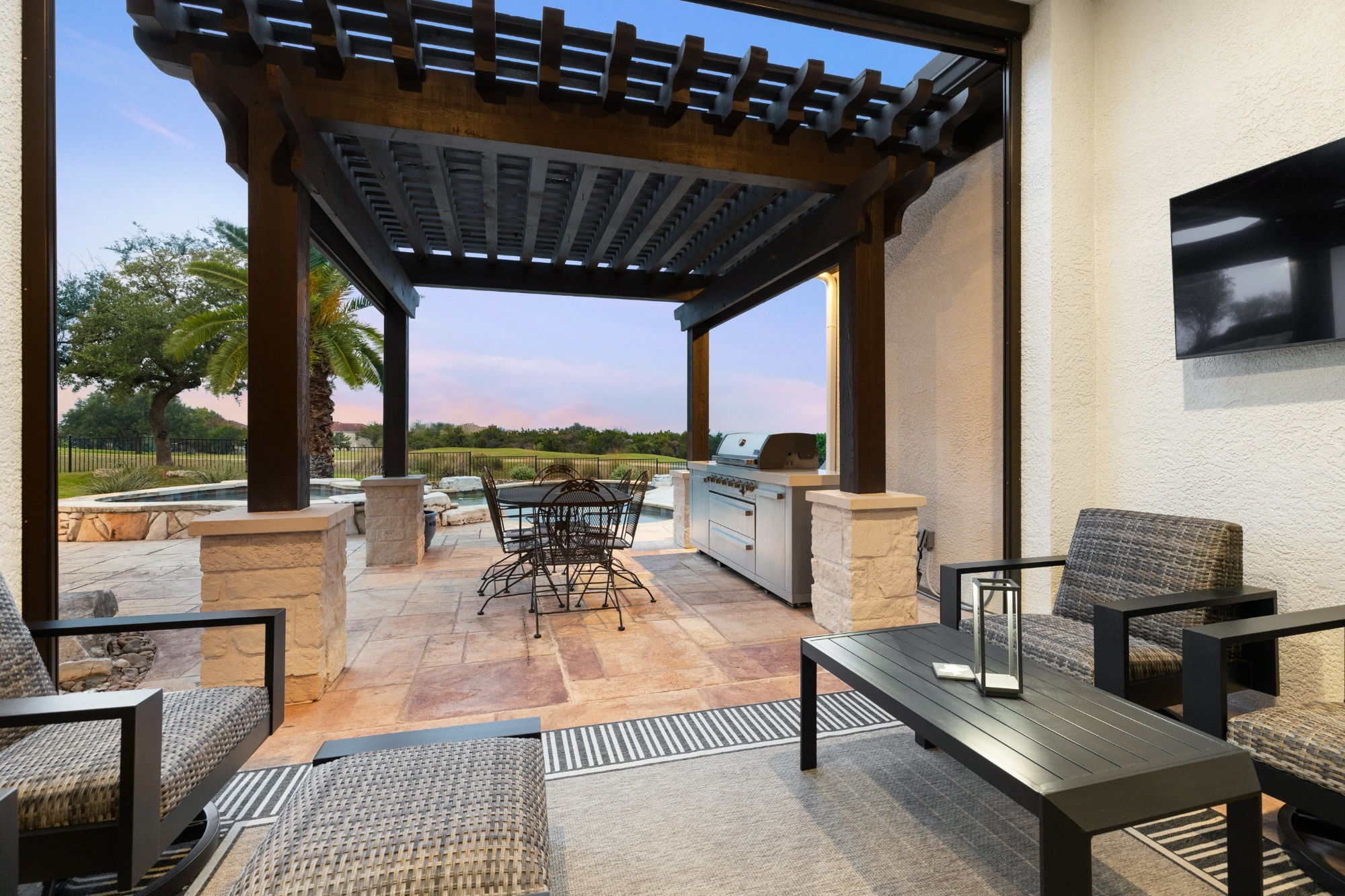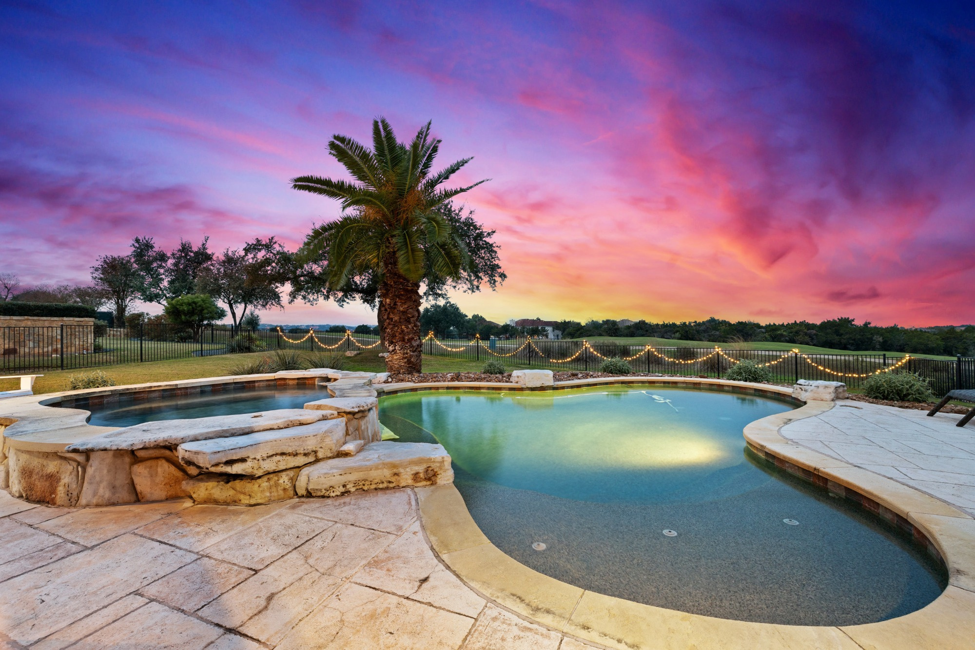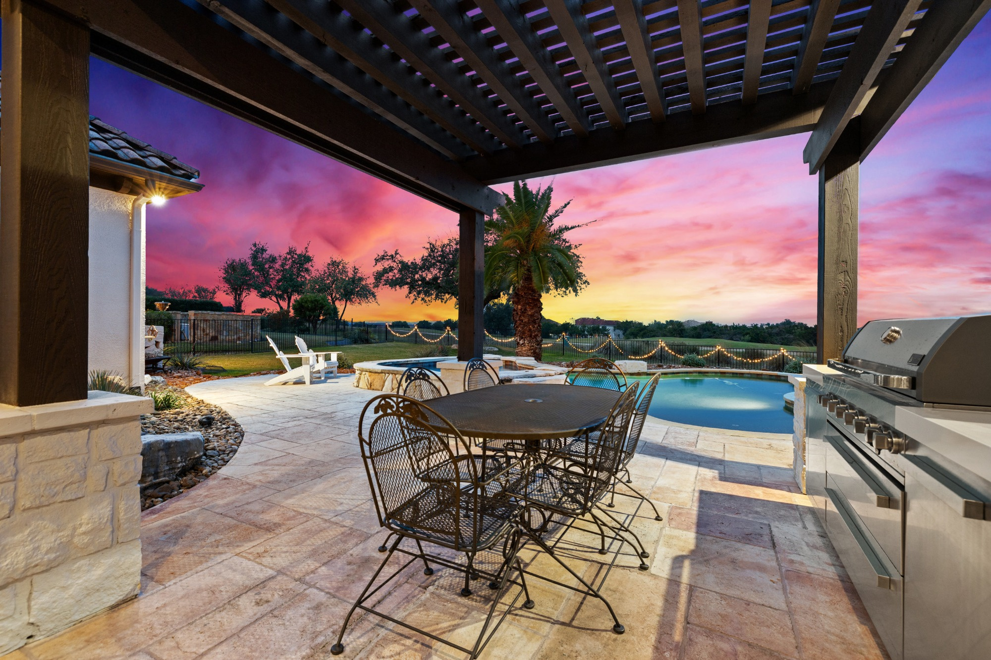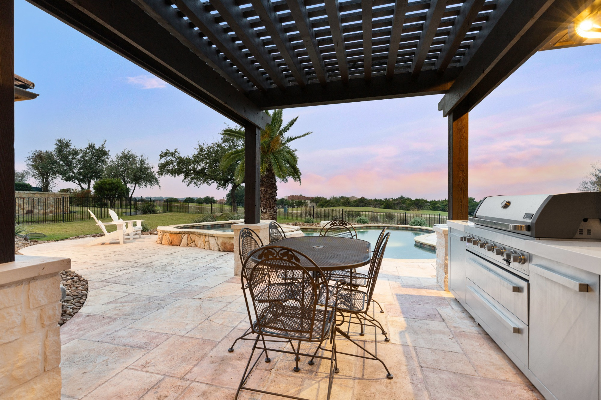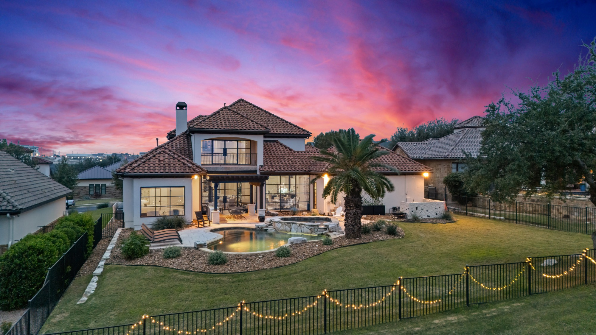 Welcome home to refined gated living in Flintrock Falls. This gorgeous hill country residence was a former Parade of Homes property boasting an exceptional location backing to the 4th green. As you arrive an impressive approach greets you with lush landscaping, circular drive, double front doors, porte cochere and motor court. The interior is just as intriguing with luxe finishes everywhere you look including wood and stone flooring under custom ceilings. Enjoy easy everyday comfort with an open floor plan filled with natural light, private study, a bar at the formal dining plus a stylish fireplace in the living room and floor to ceiling windows. The primary suite offers a luxurious retreat featuring a soaking tub, seamless glass walk in shower with rain showerhead plus a California closet that will make your jaw drop. Upstairs you will find 2 spacious bedrooms both with ensuite baths plus a fantastic game/media room with built in Murphy bed, bar, half bath, and balcony that are perfect for entertaining or an extra guest room. We saved the best for last – the resort style back yard will make you feel like you are on vacation with its pool, spa, patios, and the best panoramic golf views in the area. With over $350k in upgrades, this home is one you don’t want to miss.